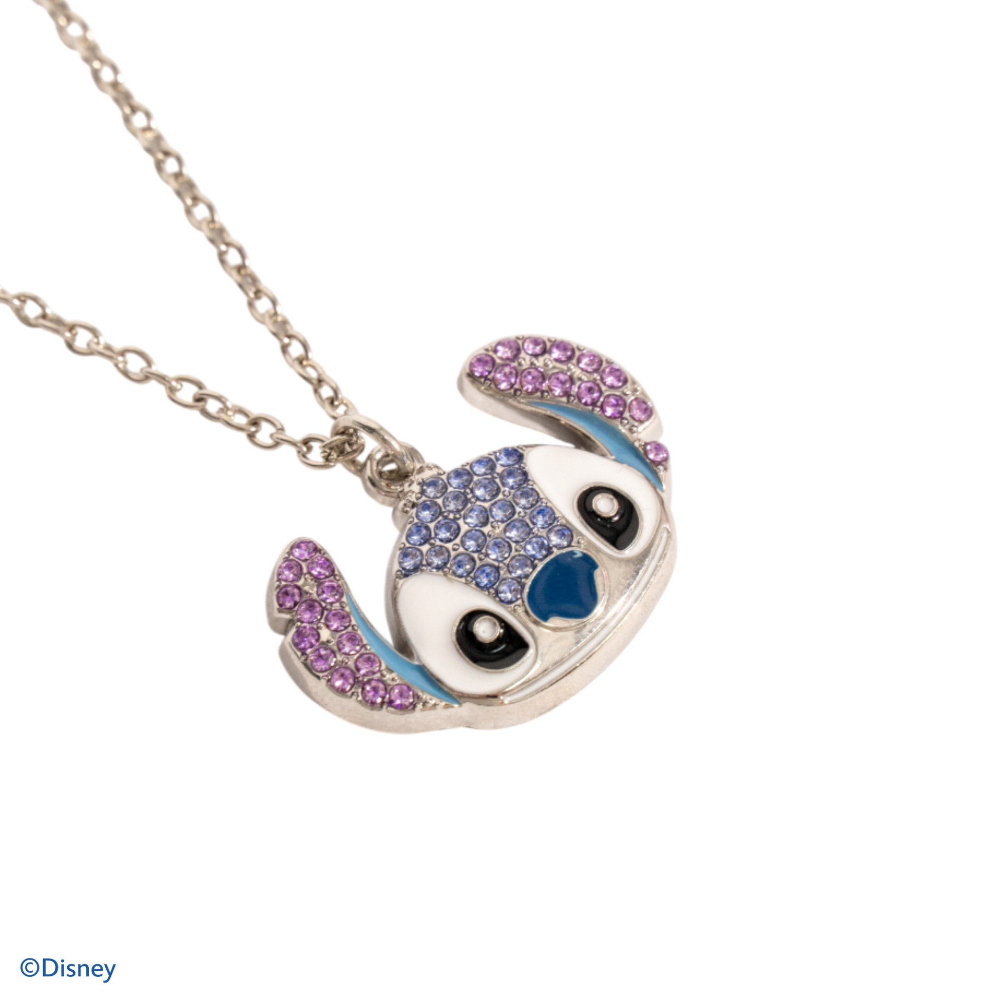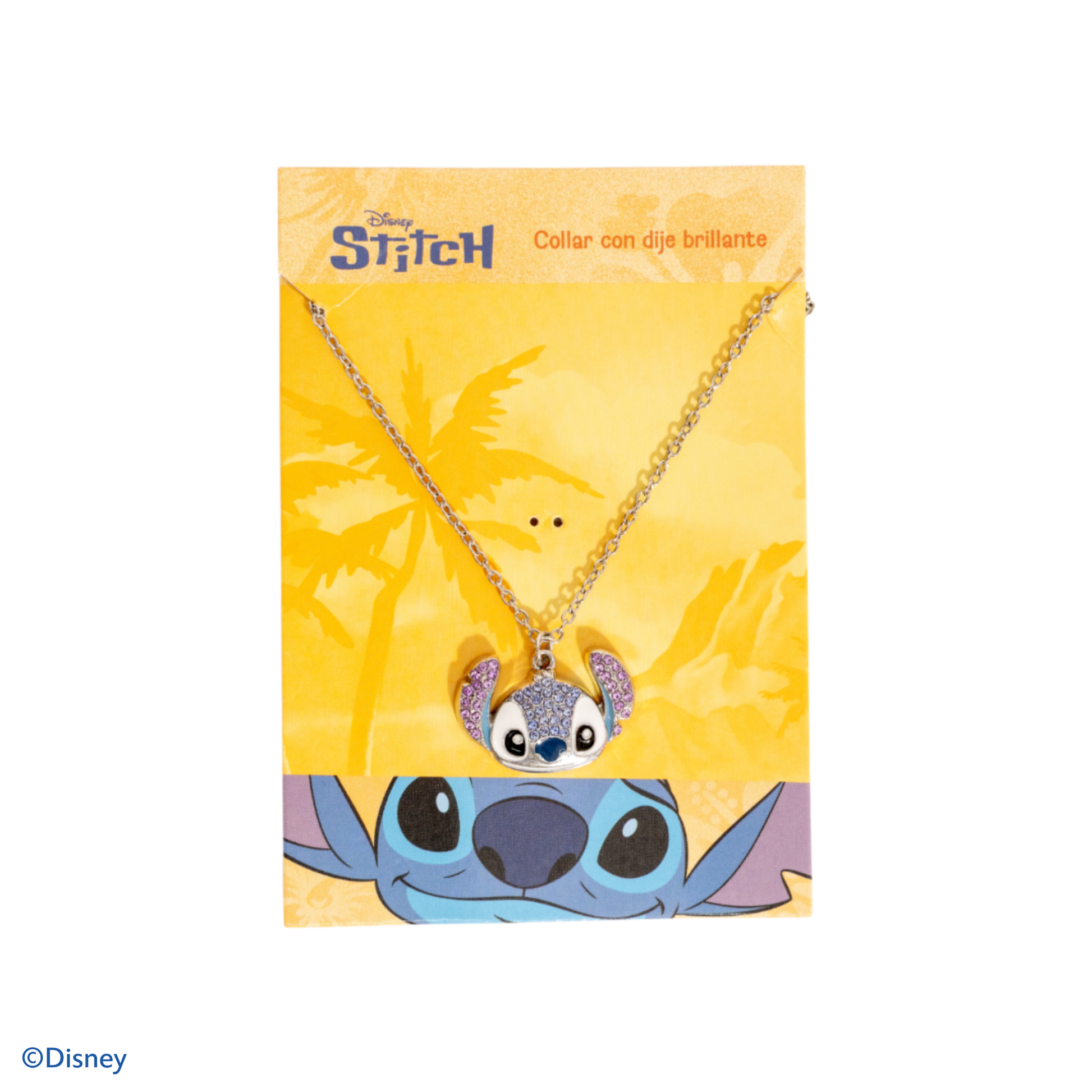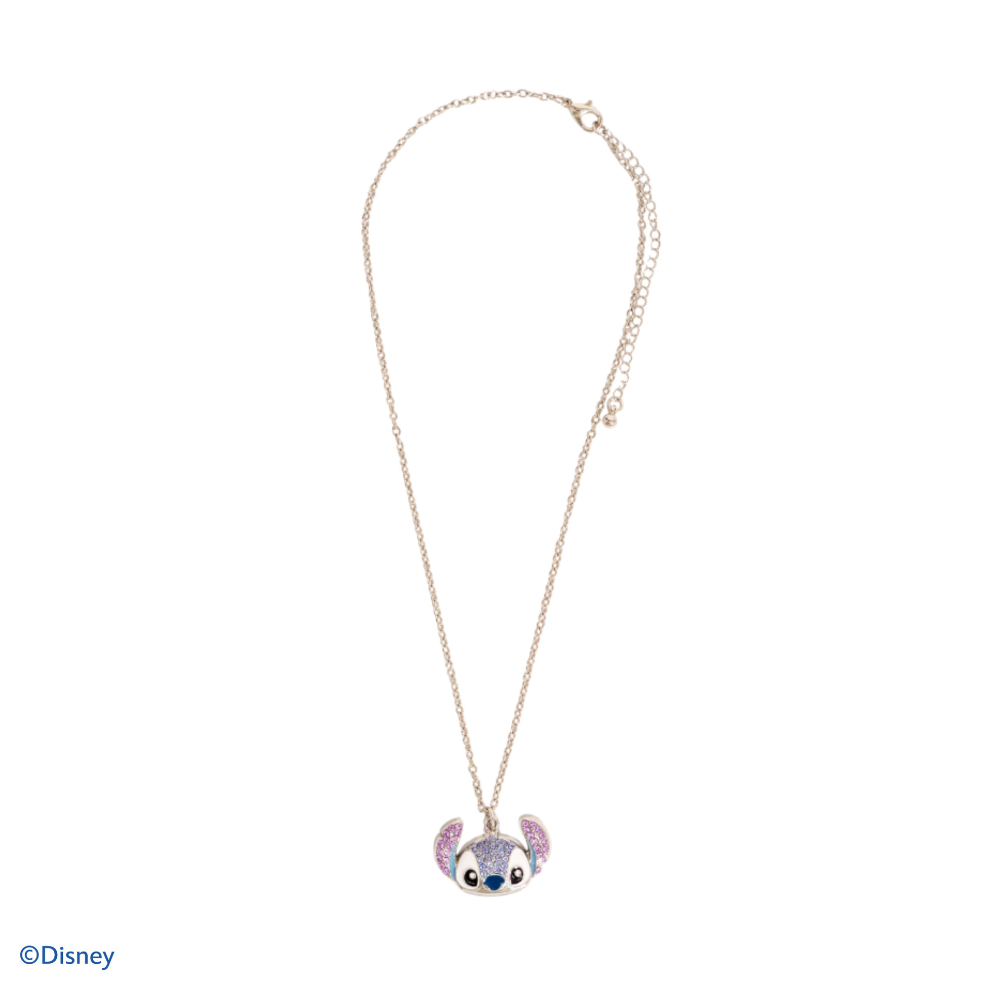 Collar en acero inoxidable plateado con apliques brillantes tipo cristales facetados en tonos azules y rosas con acabado esmaltado.